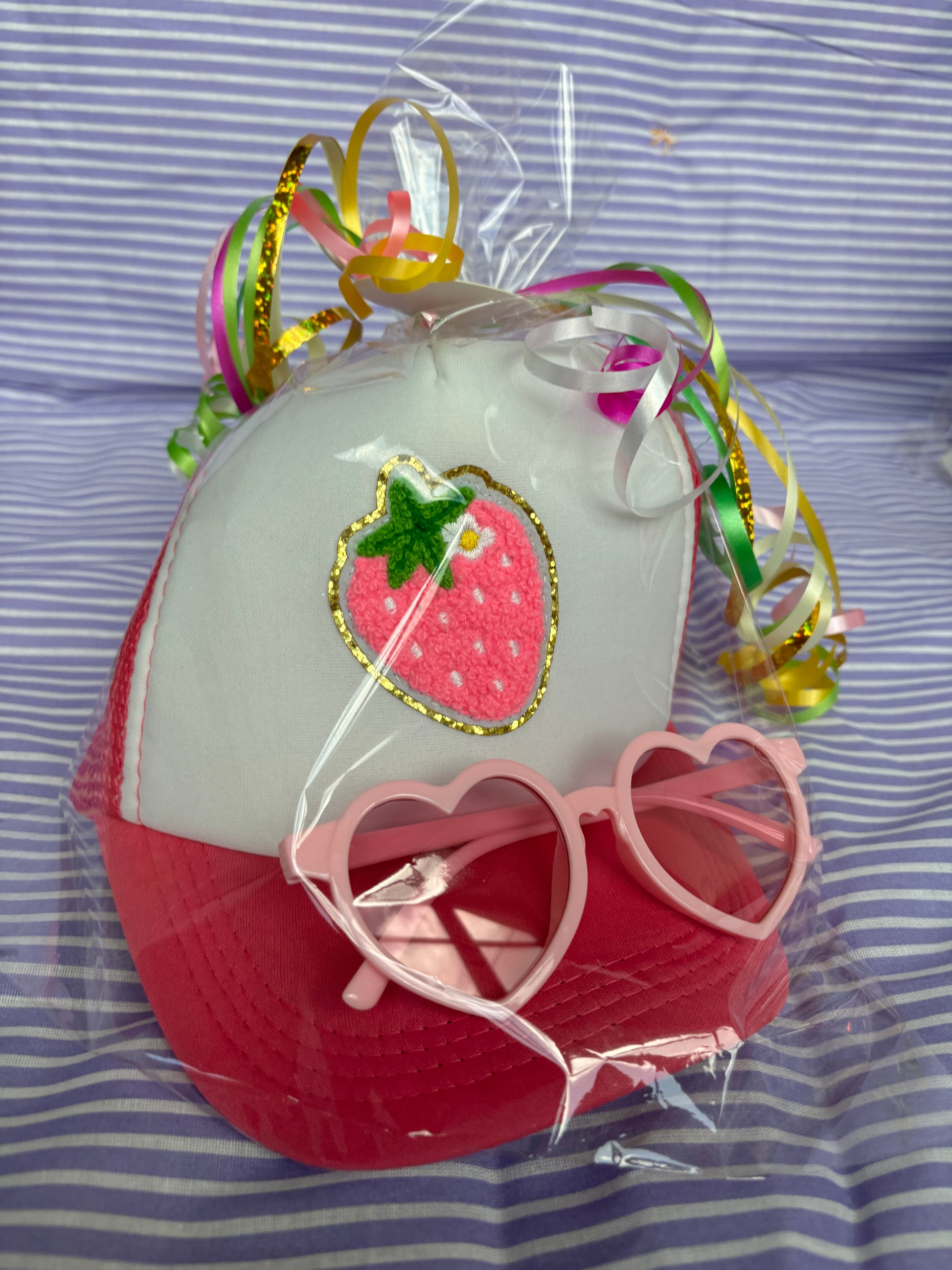Youth hat for ages 4-8 years old, with adorable hear sunglasses, chapstick, and bracelet. Perfect for fun in the sun!